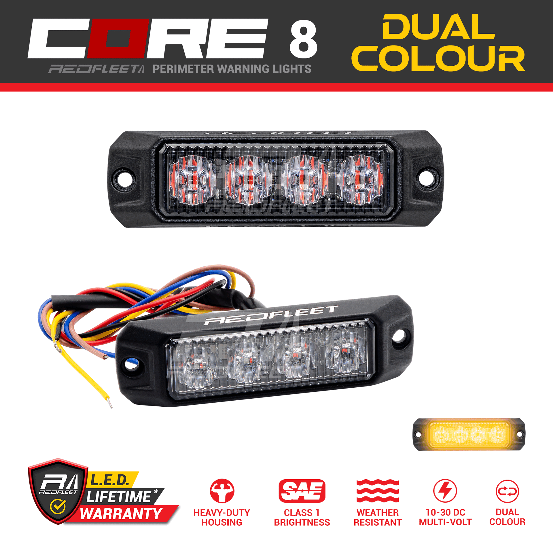 REDFLEET’s latest CORE 8 takes dual-color LED technology to the next level with a compact, heavy-duty housing and is backed by an Australian-first Lifetime LED Warranty. Perfect for all external vehicle perimeter applications, the CORE Series lightheads provide exceptional performance for both standard and emergency response vehicles, with color options including red, blue, white, amber, and yellow.